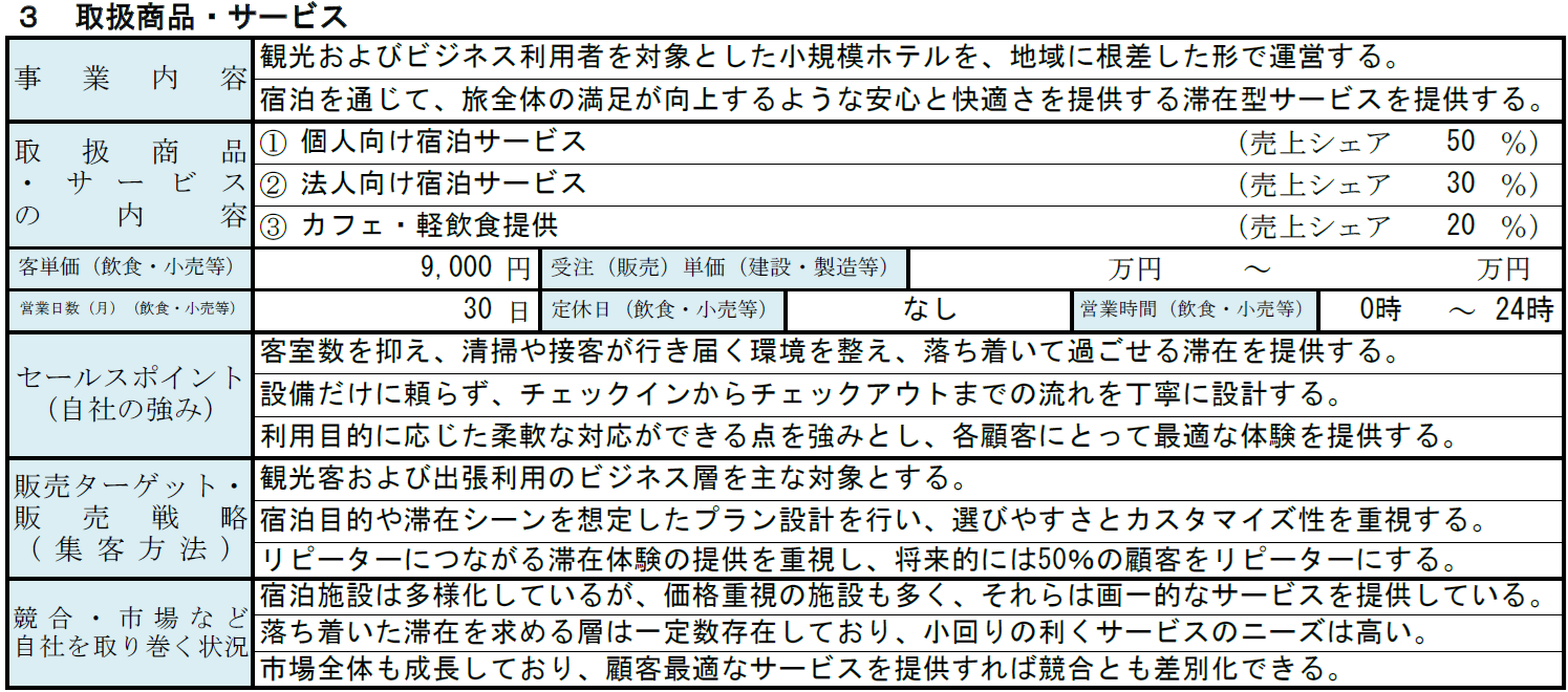 取扱商品・サービスの内容としては、事業の中心となるサービスを3つ記載します。たとえば、平均品質のスタンダードプラン、高級品質のプレミアムプラン、最高級の離れを提供するエグゼクティブプランなど、ホテルのプランや特徴が伝わるものを整理しましょう。