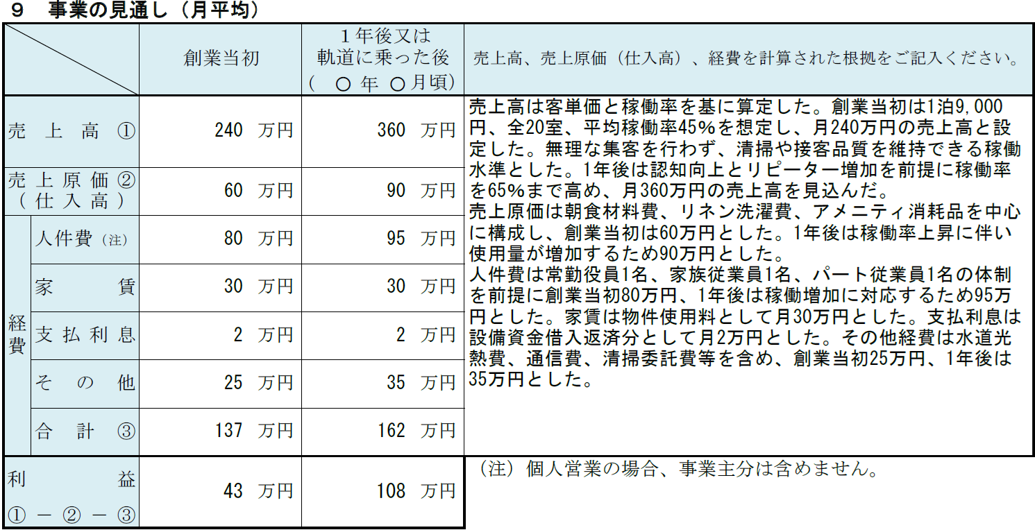 宿泊業(ホテル)の記入例⑨ 事業の見通し