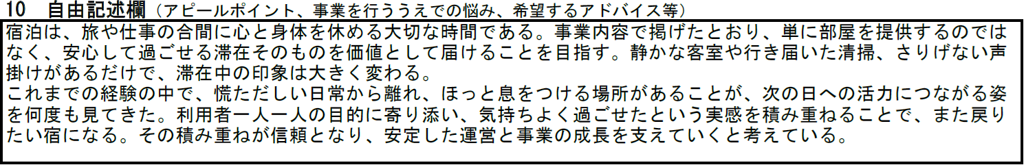 自由記述欄では、宿泊業として取り組む事業の全体像をまとめる観点から、どのような形で施設を運営し、どのような利用を想定しているのかを整理します。