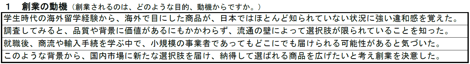 創業の動機では、輸入販売という事業に関心を持つようになった背景や、なぜ海外の商品を日本市場で扱いたいと考えるようになったのかを整理して記載します。