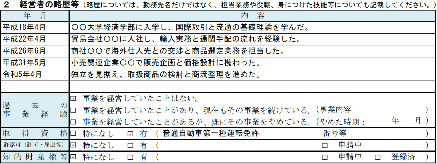 経営者の略歴等では、学歴と職務経験を時系列で整理し、輸入販売事業とのつながりが分かるように記載します。