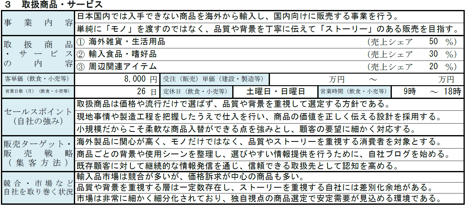 また、輸入販売事業として、どのような姿勢で商品を選び、どのような考え方で事業を継続していくのかといった大切にしたい価値観も、この欄で整理します。読み手が計画書全体を読み終えた際に、事業の方向性や構造を理解しやすくなるよう、前後の項目と重複しすぎない形でまとめることがポイントになります。