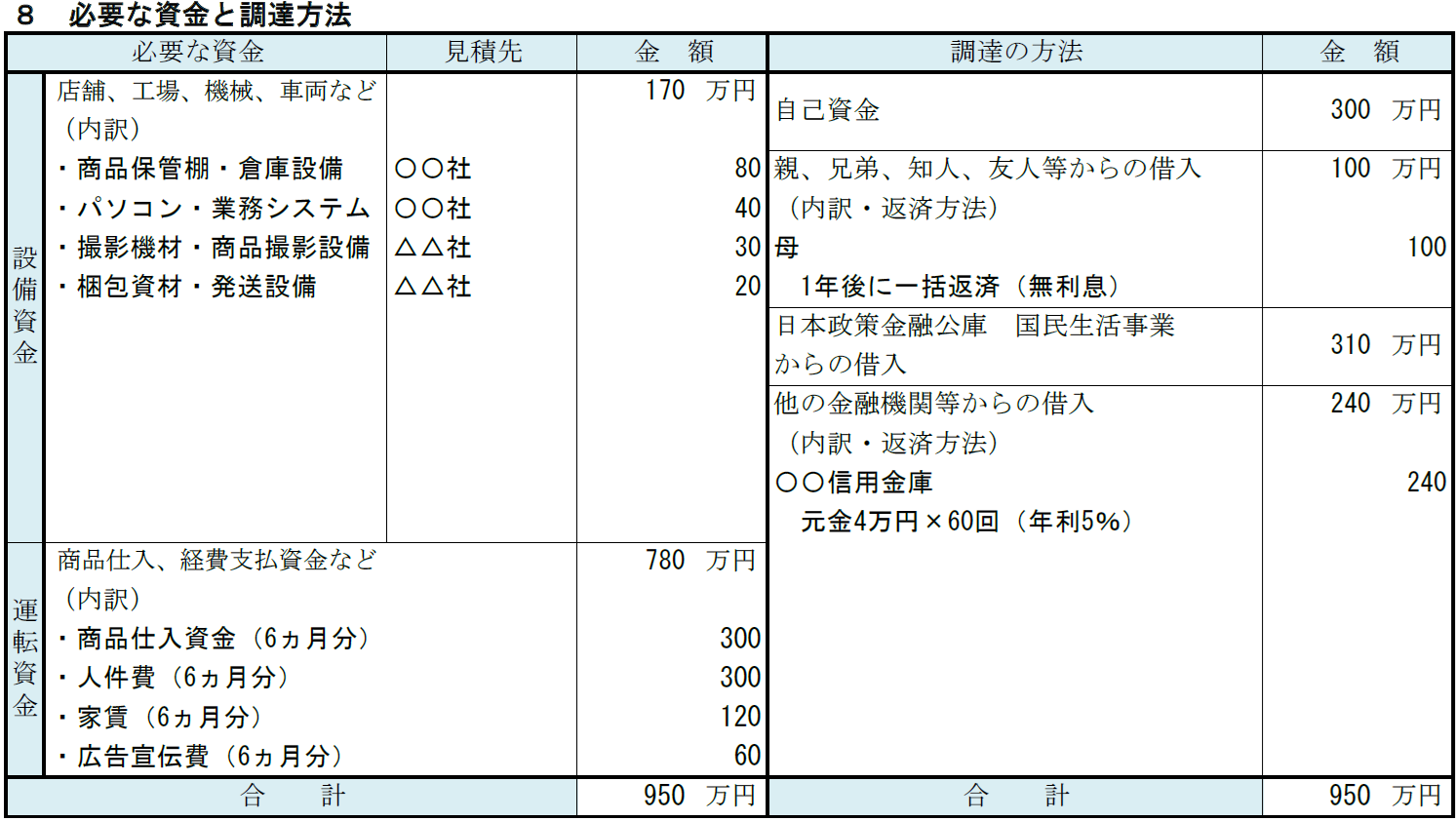 輸入販売の記入例⑧ 必要な資金と調達方法