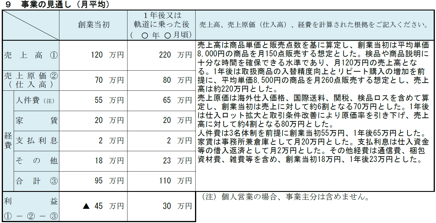 事業の見通しでは、まず売上高について、取扱商品数、販売単価、販売数量を踏まえた考え方を整理します。輸入販売では、商品の入荷タイミングや在庫量によって販売可能な数量が左右されるため、無理のない販売計画を前提に売上の構造を考えます。継続的に販売できる商品と、期間限定で扱う商品を組み合わせることで、売上の安定を図る考え方もあるかもしれません。
