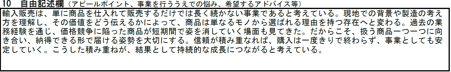 自由記述欄では、これまでに整理してきた各項目を踏まえ、輸入販売事業の全体像をどのようにまとめるかを記載します。特定の数字や詳細な条件を追加するというよりも、事業内容、運営体制、資金計画、今後の展開といった要素を一度整理し直し、全体を俯瞰する役割を持たせます。