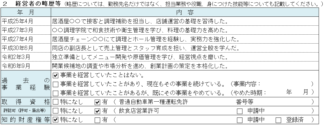 また、開業準備としてメニュー研究、接客方法の学習、資格取得、店舗視察など、自ら学び続けてきた姿勢を記載すると、誠実さと熱意が伝わる略歴になります。