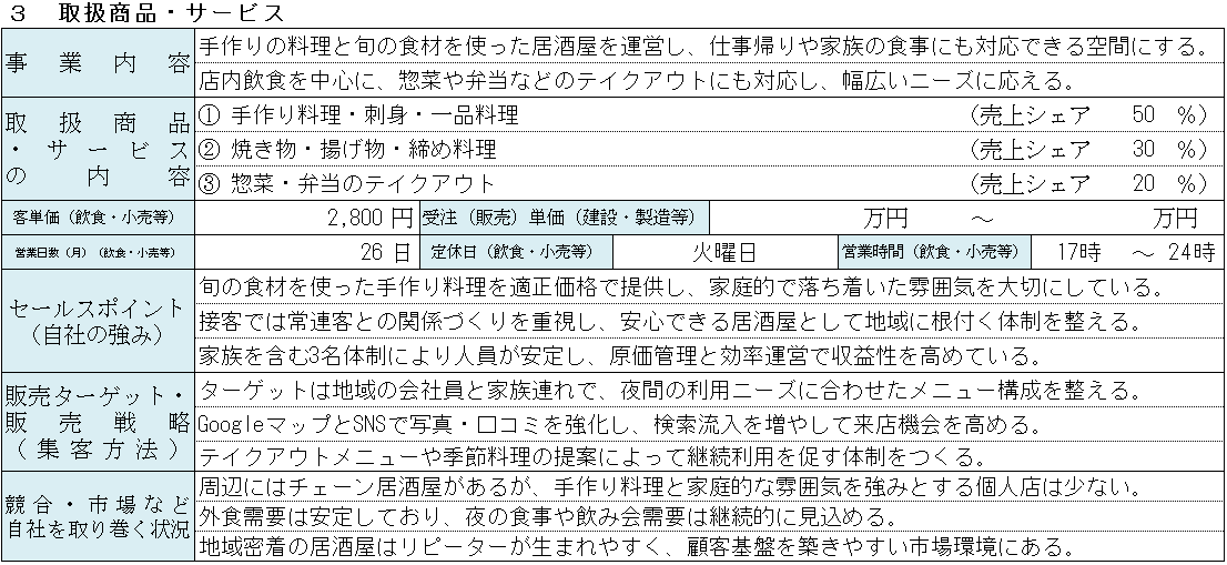 居酒屋の取扱商品・サービスでは、料理やドリンクの特徴、店の雰囲気、提供価値など、店の個性を読み手が自然に想像できるように記載します。