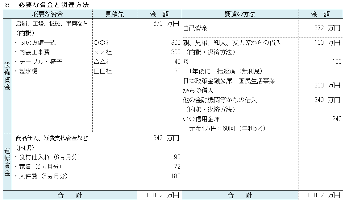 居酒屋の記入例⑧ 必要な資金と調達方法