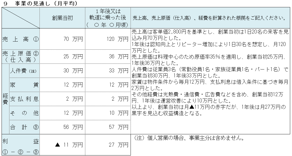 事業の見通しでは、売上と経費の根拠を丁寧に説明します。居酒屋の売上は客数と客単価から構成され、特にドリンク比率が高いため、想定値に根拠を持たせることが重要です。