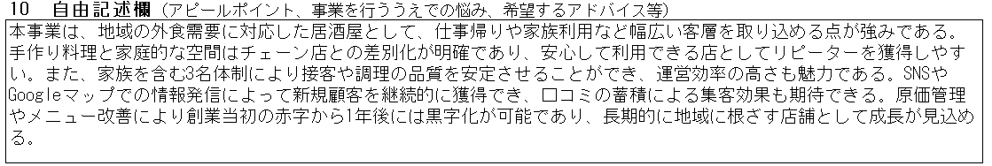 自由記述欄は、計画書全体を締めくくる大切な項目です。居酒屋の温かさや魅力が自然に伝わる文章に仕上げることで、計画に深みが生まれます。