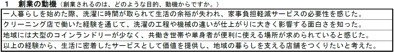 創業の動機においてはこうした原点となる思いに加え、設備や料金体系を調べたり、他店の利用状況を見たり、地域の人口や住環境を調べるなど、準備を進めてきた過程も記載すると、創業への姿勢が自然に伝わります。