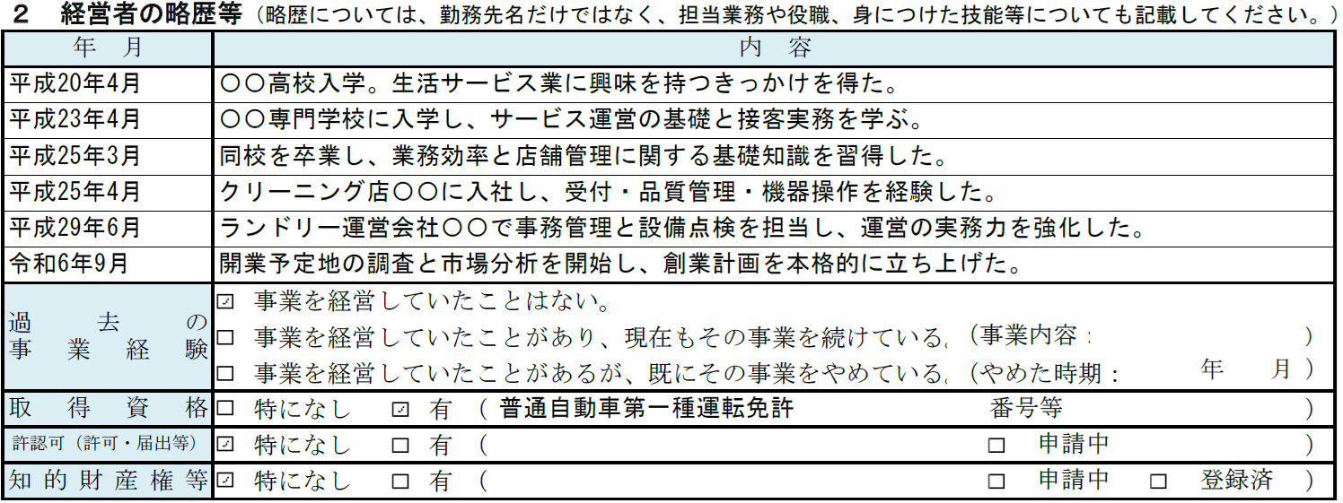 経営者の略歴では、これまでの経験が店舗運営にどのように役立つのかを整理して記載します。