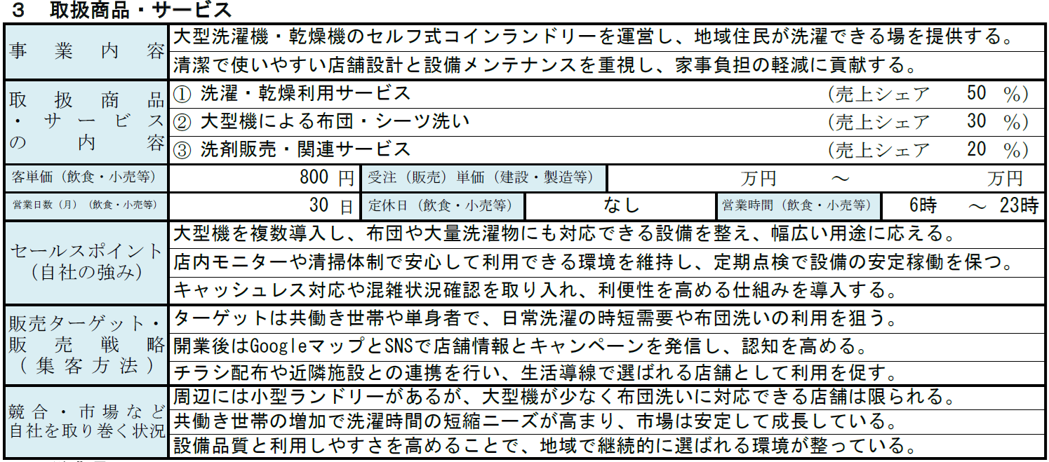 セールスポイントでは、大型機器の設置、短時間で乾燥できる設備、店内の清潔さ、夜間でも安心して利用できる環境、キャッシュレス決済対応など、店舗として工夫している点などが当てはまります。利用者が長く通いやすいようにしている点など、あなたの事業特有の魅力を伝えることがポイントです。