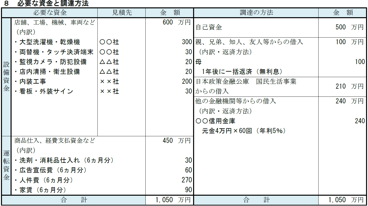 コインランドリーの記入例⑧ 必要な資金と調達方法