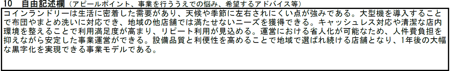 自由記述欄には、コインランドリーを通じて提供したい価値や、地域にどのような場をつくりたいかについて記載します。忙しい日々の中で洗濯時間が短縮されることや、誰でも気軽に利用できる環境づくりへの思いなどを添えると、事業への姿勢が伝わります。