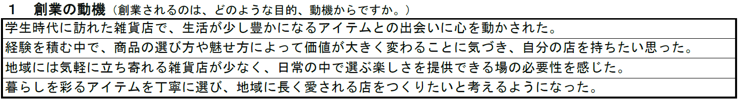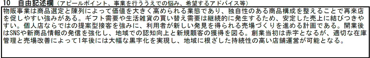 また、商品選びの基準を大切にする姿勢や、地域の方が気軽に立ち寄れる店舗をめざす考え方、新しいブランドや商品の開拓に挑戦していく意欲など、事業の方向性につながる内容を添えておくと、読み手にも伝わりやすい自由記述欄になります。