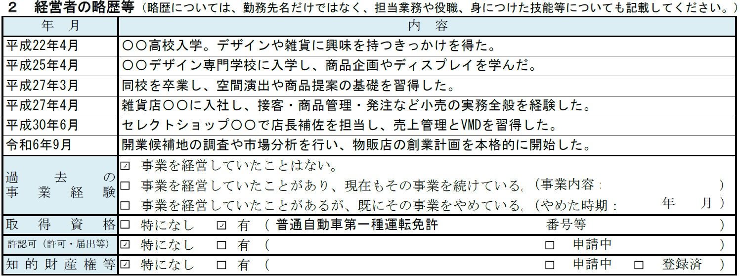経営者の略歴を記載する際には、これまでの職務経験が物販事業の運営にどのようにつながるのかを整理します。小売店での接客経験、仕入れや在庫管理に携わった経験、売場づくりや販売促進を担当した経験などは、物販の運営と相性が良く、そのまま開業後の業務に活かしやすい力となります。