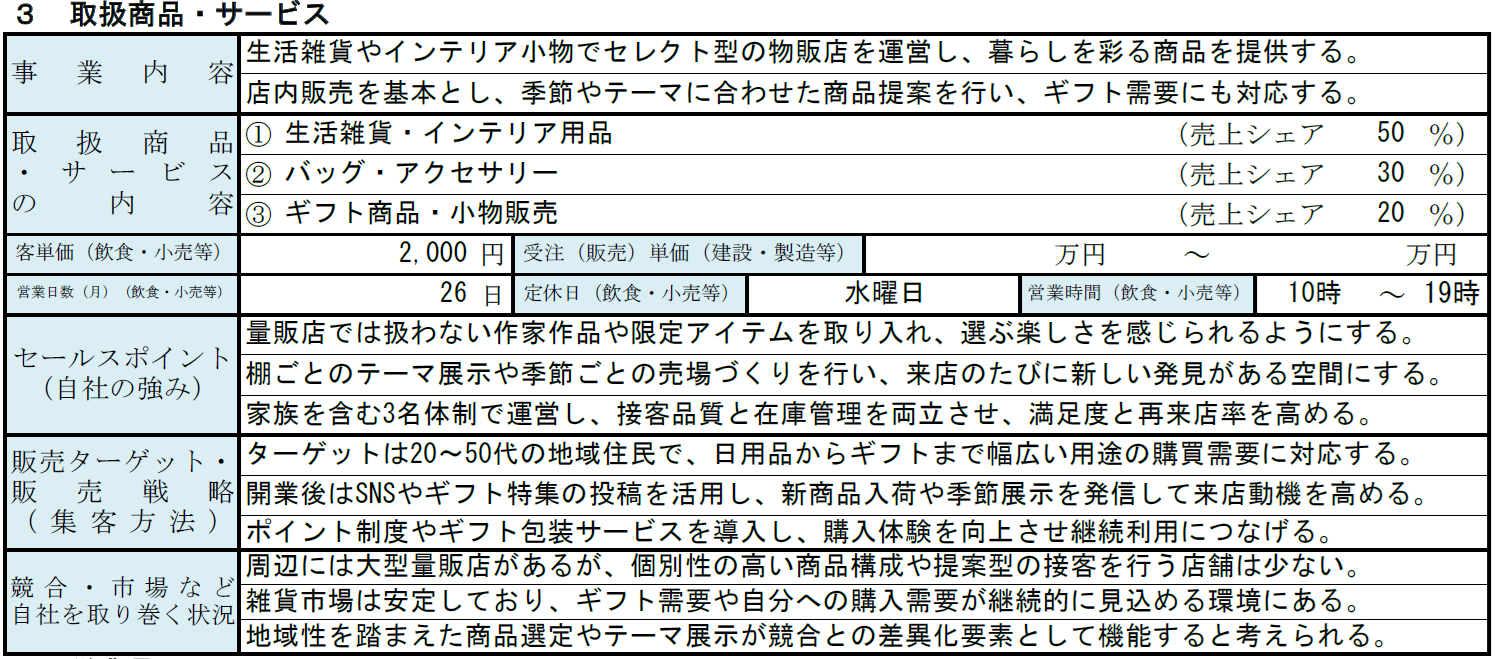 物販事業の取扱商品・サービスを記載する際には、どのような商品を中心に取り扱うのかを示すところからまとめていきます。雑貨、日用品、アパレル、インテリア小物など、扱うカテゴリーに合わせて、暮らしに寄り添う商品を届ける事業であることを説明していきます。