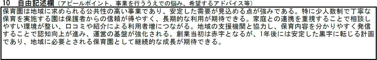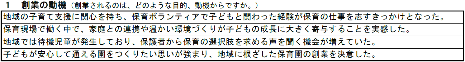 創業の動機では、こうした背景に触れながら、保育方針の検討、保育環境の研究、関連制度の学習、地域の子育てニーズの調査、開園に向けた準備など、積み重ねてきた取り組みを記載すると、創業への姿勢がより伝わりやすくなります。