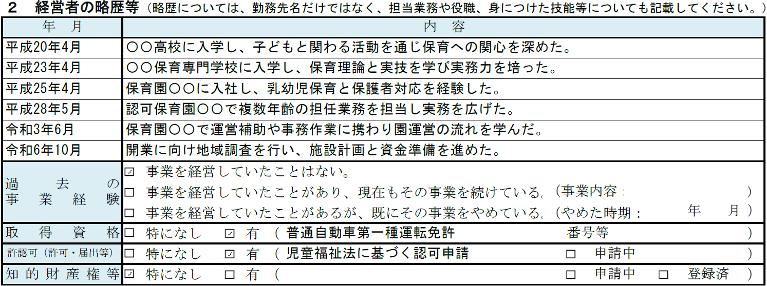 経営者の略歴では、過去の経験が保育園の運営にどのように役立つのかを整理して記載します。保育や教育に関わってきた場合には、子どもへの関わり方や保育の基本姿勢を学んだ経験が運営に直結するでしょう。
