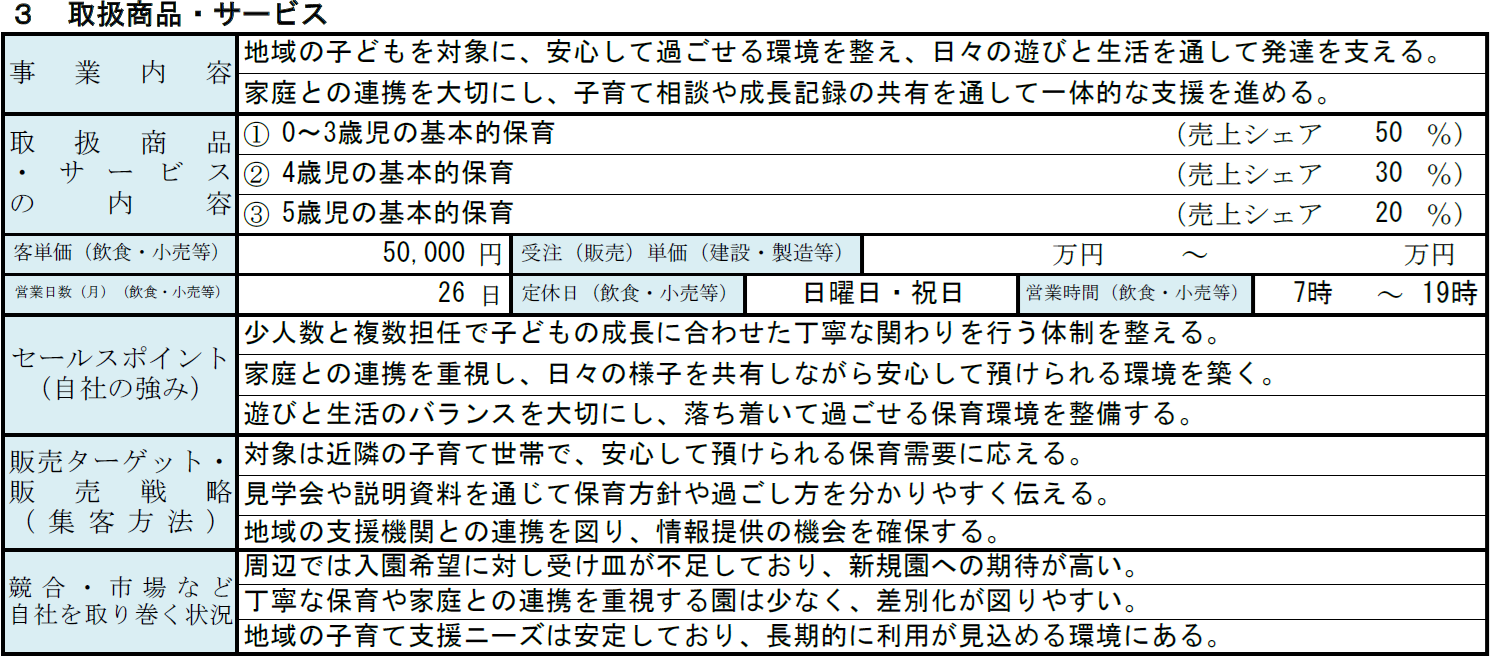 競合や市場環境では、周辺の保育園の定員や特徴、地域の待機児童の状況、子育て支援の取り組みなどを踏まえ、園がどのような位置づけでサービスを提供するかを記載します。