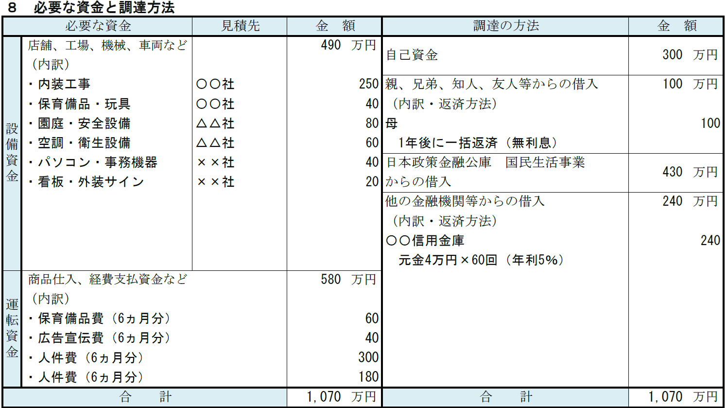 調達方法としては、自己資金、家族からの支援、金融機関の融資などを記載し、必要な資金をどのように確保するかを整理します。