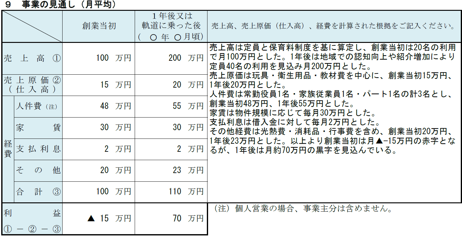 経費では、人件費、家賃、光熱費、給食材料費、教材費、保険料、広告費、車両費などを積み上げて計画します。固定費が一定程度発生するため、収支の流れを整理し、創業当初の損益のイメージを読み手に伝えます。