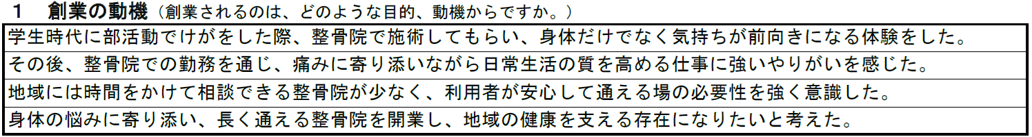 例えば、これまで柔道整復師として学び、実務を積む中で、お客様一人ひとりの症状に向き合い、改善に至る過程を支えることに大きなやりがいを感じてきたことなども創業の動機として挙げられるでしょう。