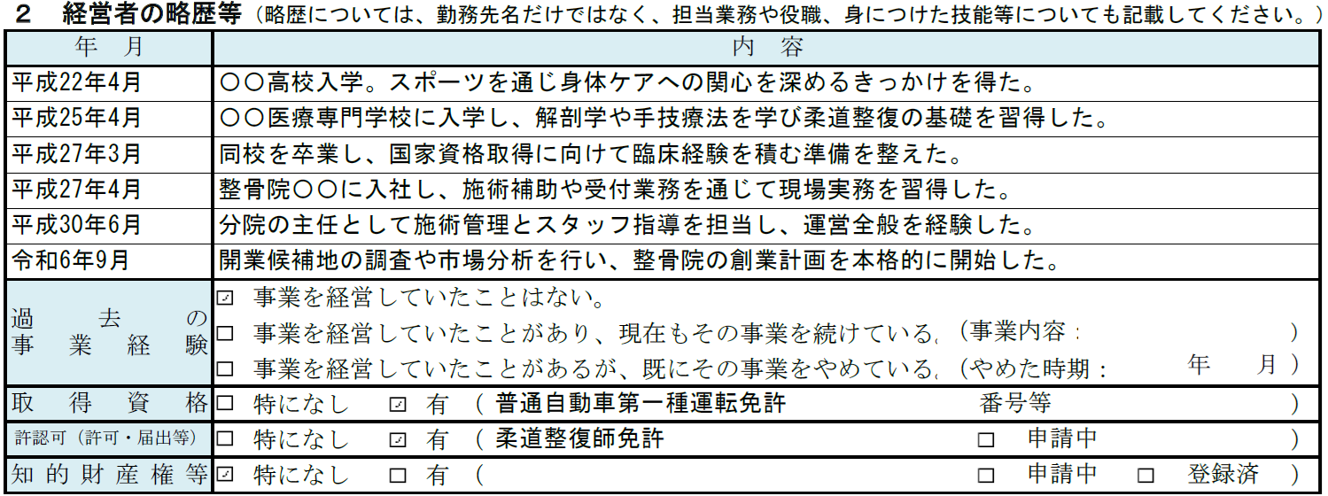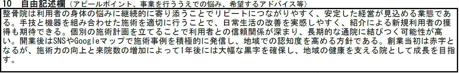 また、ここでは技術研修や勉強会への参加、患者様の声をもとにした施術方法の研究など、開業に向けて取り組んできた準備を記載することで、整骨院を運営していく姿勢がより伝わりやすくなりますので、積極的に記載するようにしましょう。