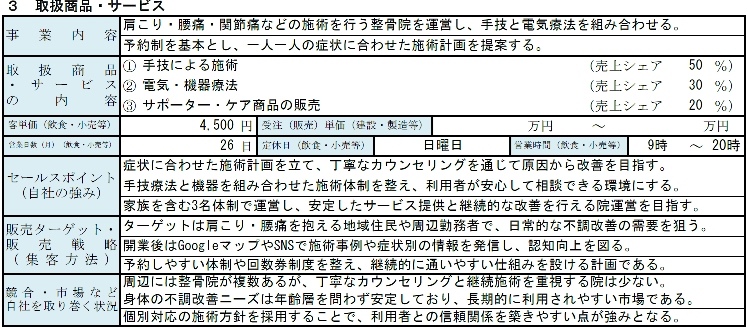 競合や市場環境を説明する際には、周辺にある整骨院の特徴や、全身調整・自費施術の需要の高まりなどを踏まえながら、自院がどのような位置づけをめざすのかを簡潔にまとめます。技術のこだわりや通いやすさなど、自院の強みが自然に伝わるように表現すると良いです。