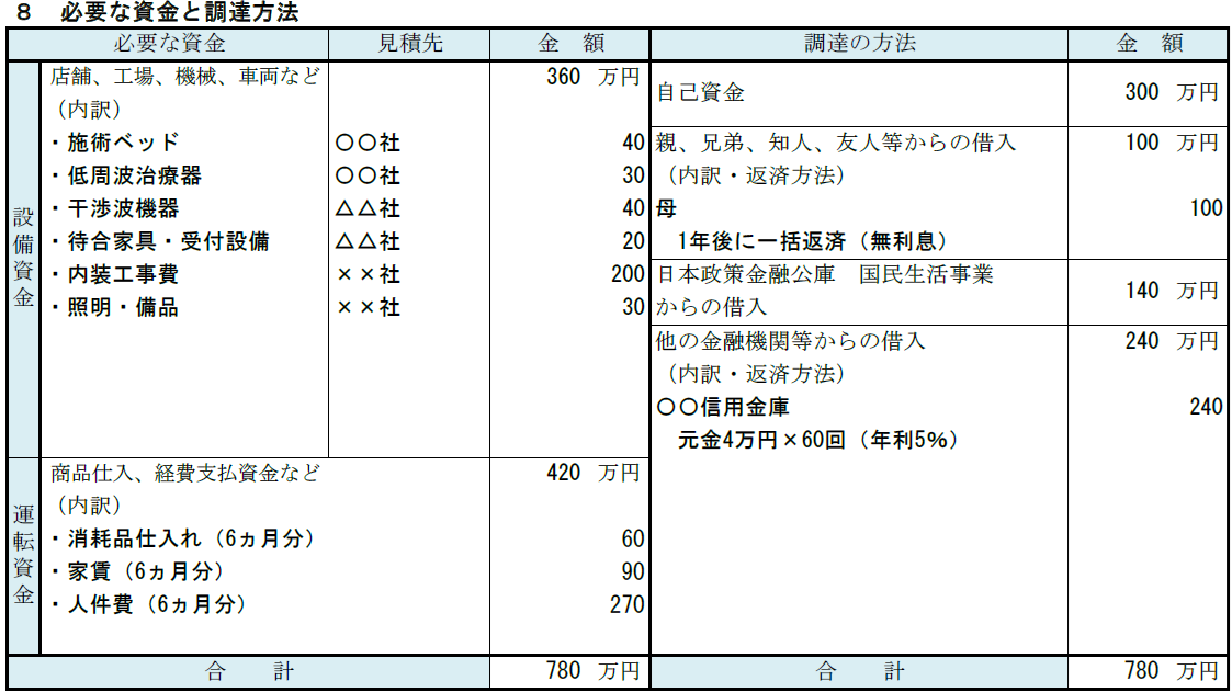 整骨院の記入例⑧ 必要な資金と調達方法