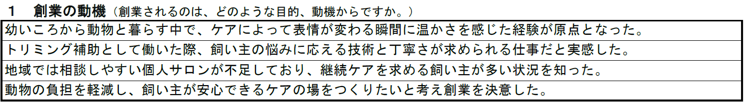 創業の動機では、ペットサロンを始めたいと考えるようになった背景を、自身の価値観や体験をもとに整理して記載します。