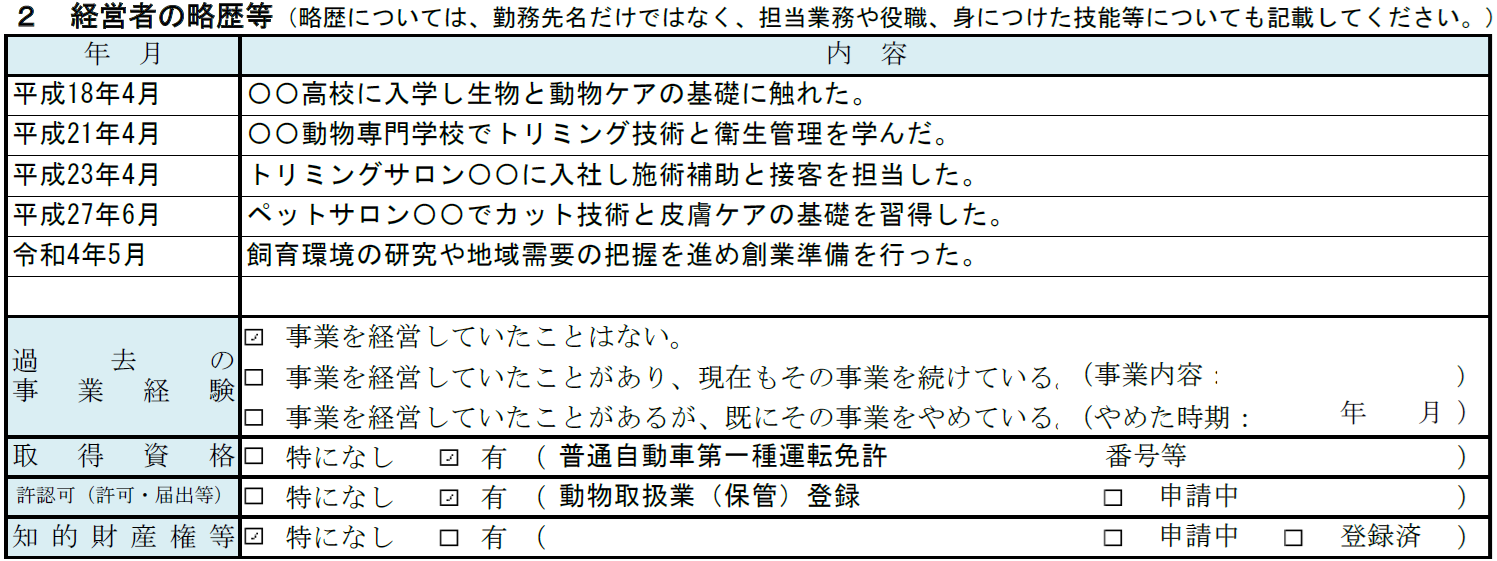 例えば、動物関連の専門学校や福祉・サービス業における学習経験がある場合には、そこで得た知識や姿勢のうち事業に活かせる部分を簡潔に示します。