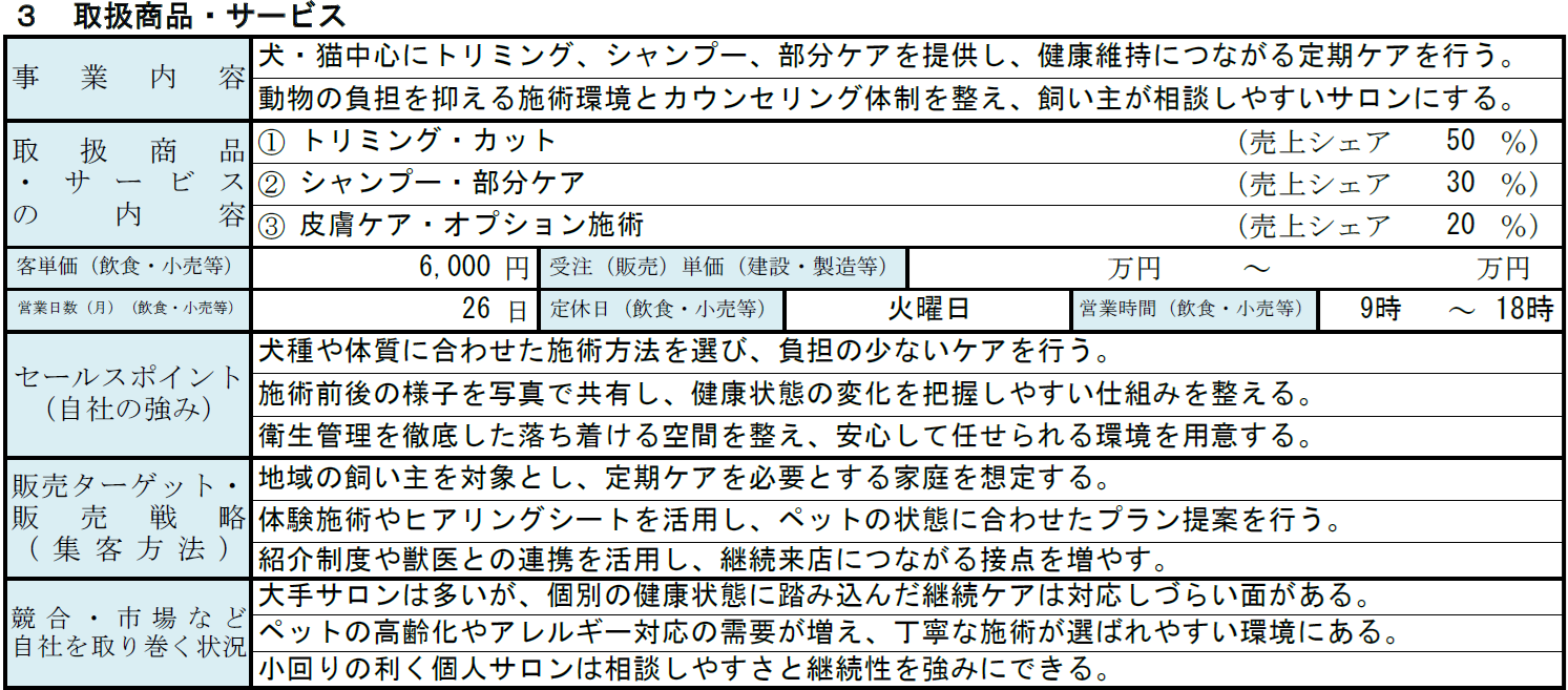 また、競合・市場環境では、近隣のペットサロンの特徴、価格帯、予約状況、犬種構成、動物病院の併設サービスの存在などを踏まえ、どのような位置づけで事業を行うかを説明します。ここで、あなたの事業の勝ち筋を表現していきましょう。
