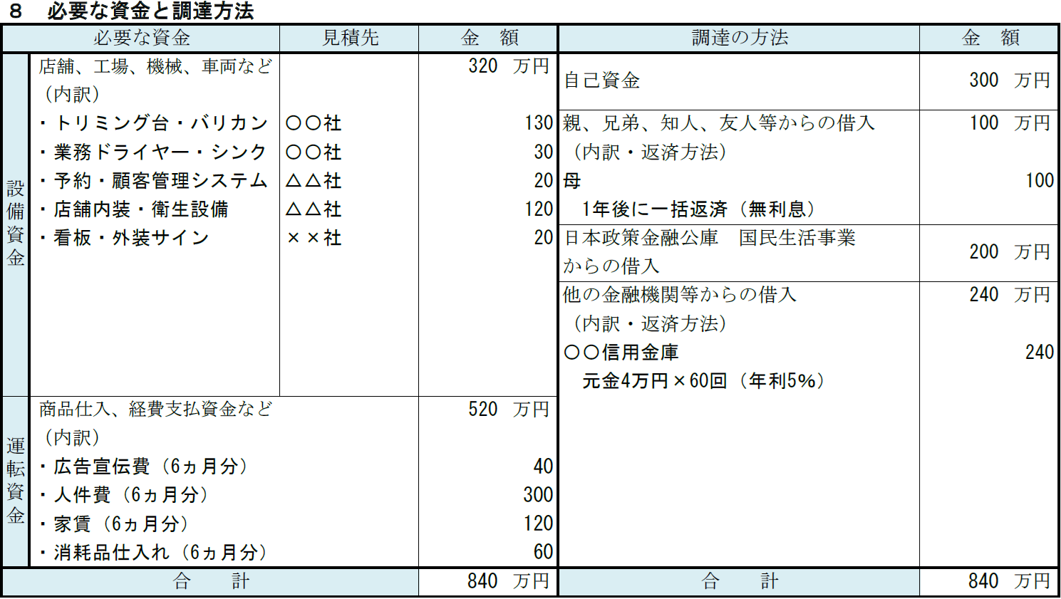 ペットサロンの記入例⑧ 必要な資金と調達方法
