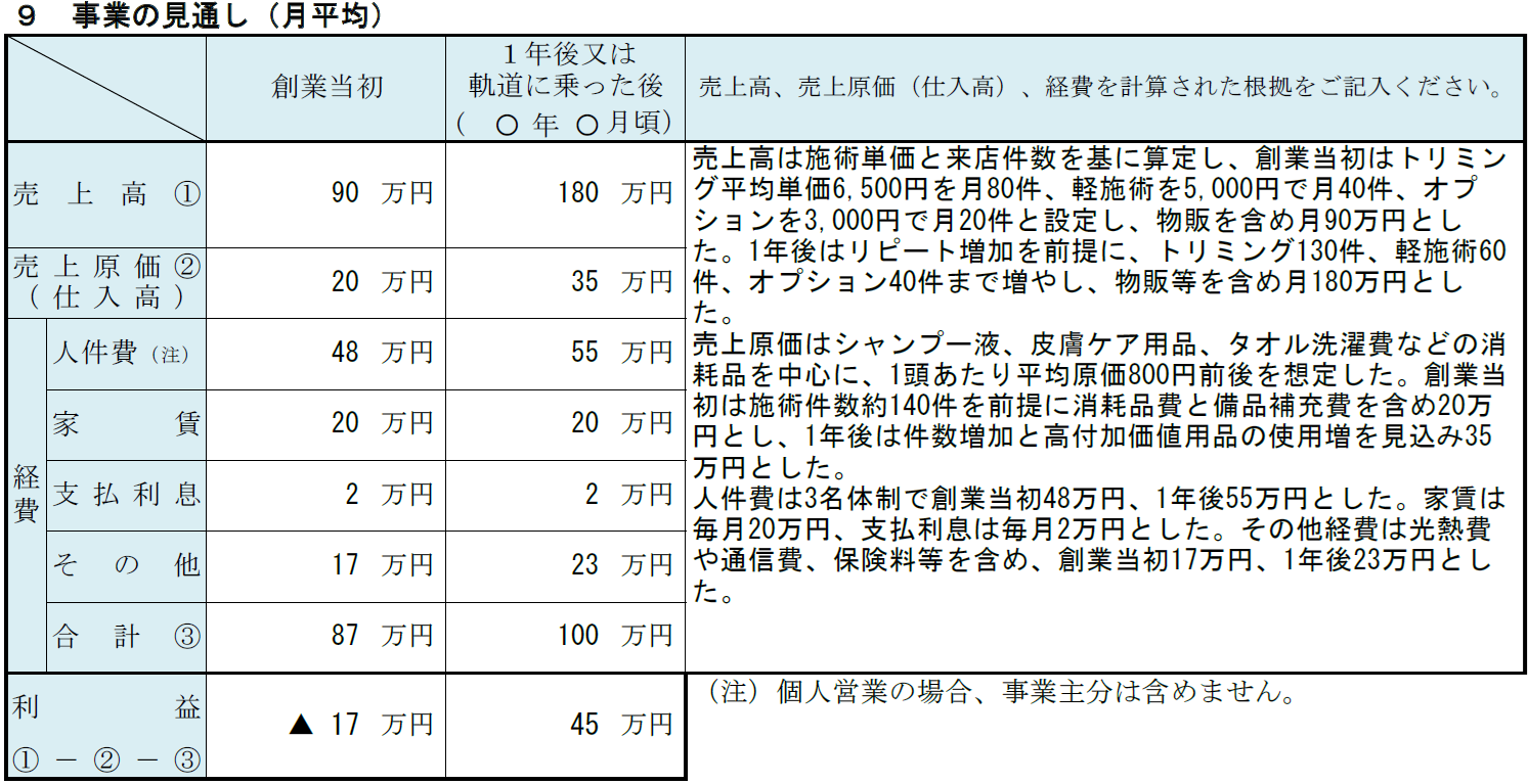 また、SNSでの情報発信や口コミによる広がりが予約に与える影響、ペットの健康や美容の意識向上に伴う需要の増加など、創業後にどのように事業をのばしていくのかについても触れることで、事業の将来性をより明確に示すことができます。