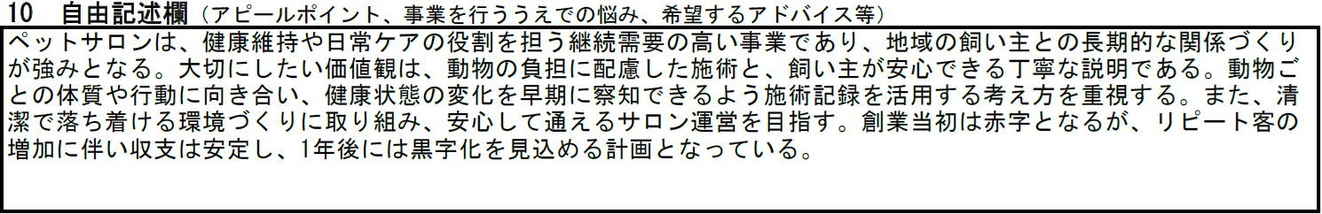 自由記述欄では、ペットサロン事業の市場環境や競争環境、財務計画といった事業の全体像はもちろん、運営の中で大切にしたい考え方もまとめていきましょう。