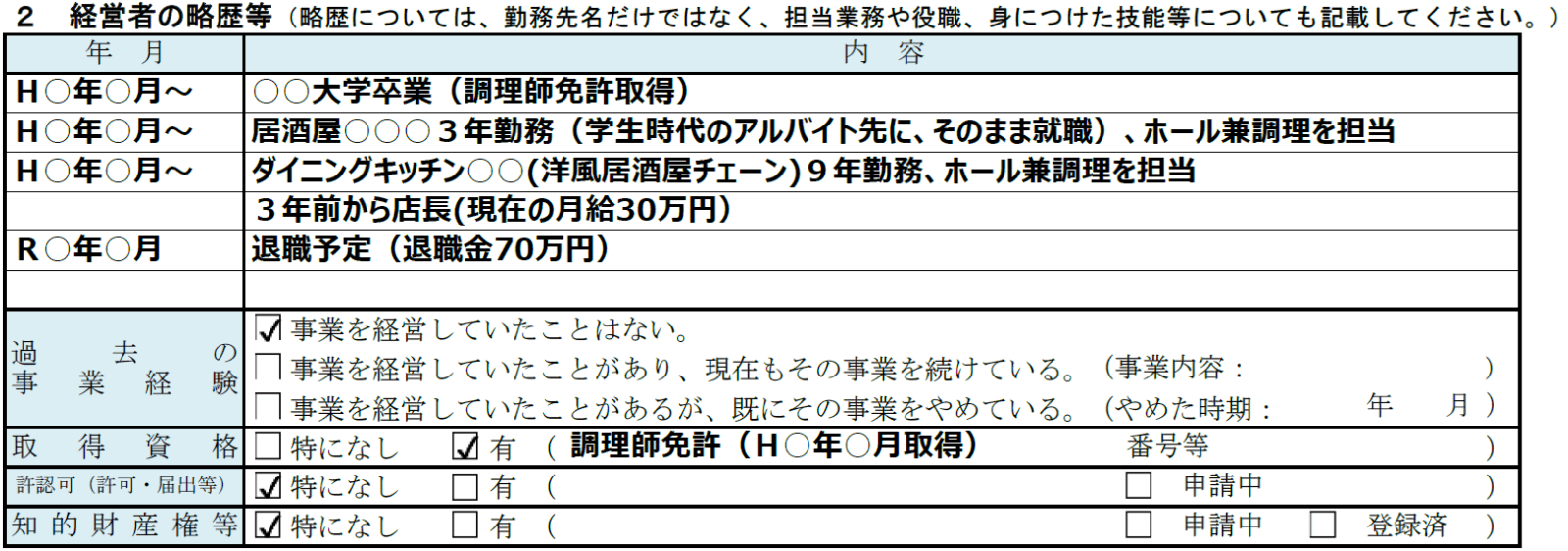 学校名や職場名をシンプルに記載するのではなく、創業する事業に関連する業務や役職、身につけた技能や保有している資格についても詳しく言及することが重要です。