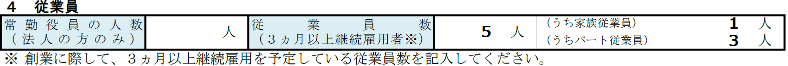 ここはシンプルに、常勤役員の人数や、創業に際して3ヵ月以上の継続雇用を予定している従業員数およびその内訳を記載します。