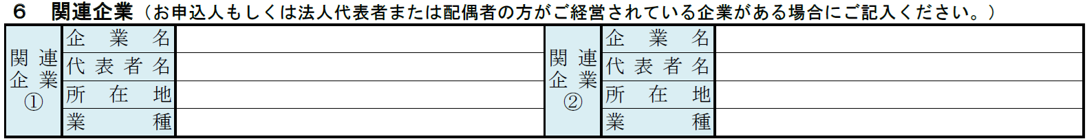 関連企業では、融資申込者・法人代表者・配偶者が経営されている企業がある場合に記載します。
