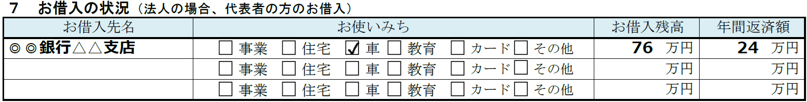事業および創業者自身に関する借入の状況を記載します。