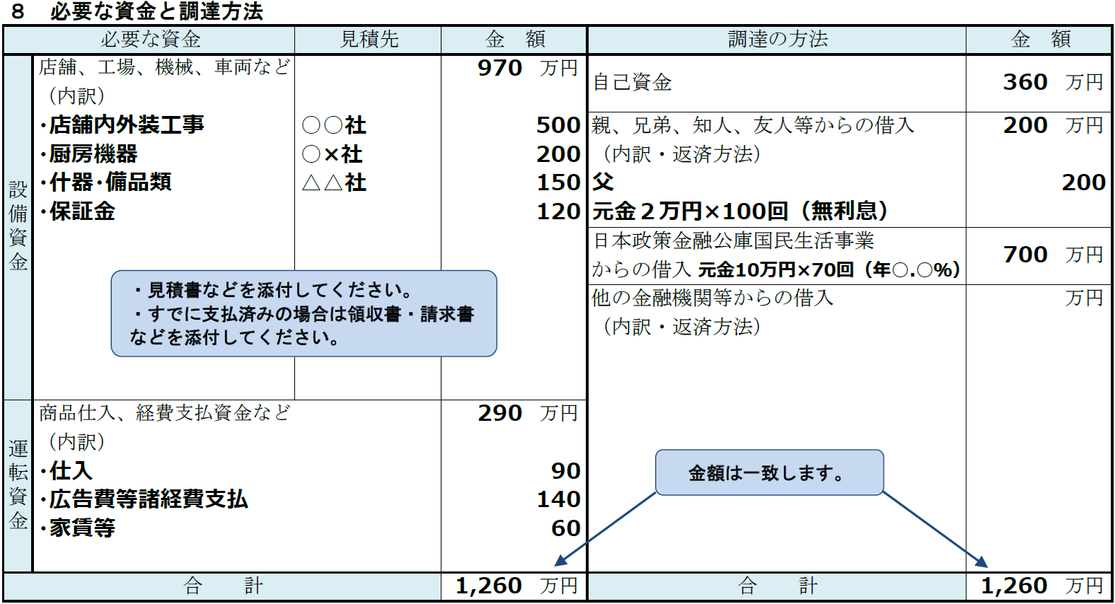 ⑧必要な資金と調達方法