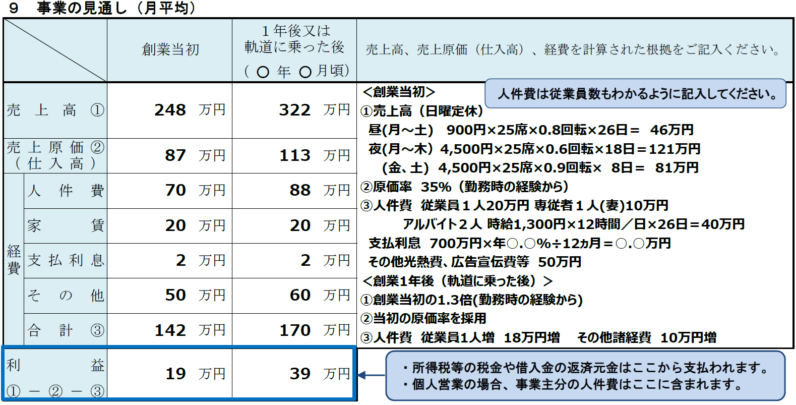 経費についても同様の考え方で、人件費・家賃・支払利息・その他などの項目ごとに算出し、説得力のある内容に仕上げます。