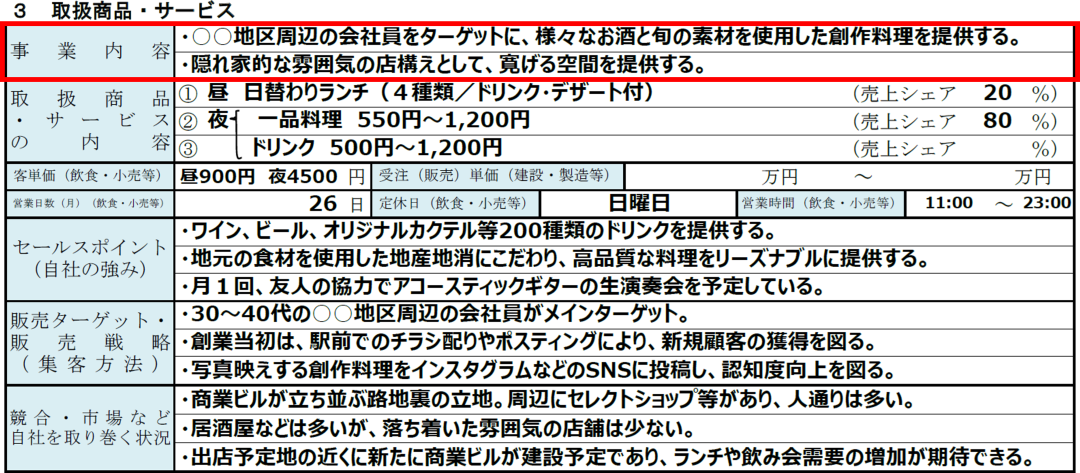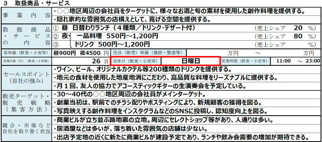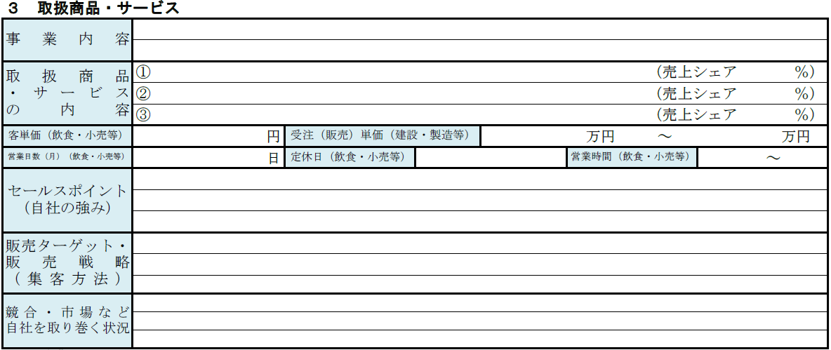 同じ業種・業態の事業はすでに数多く存在しているため、取扱商品・サービスでは、なぜあなたの事業が生き残れるのかを明確に示す必要があります。