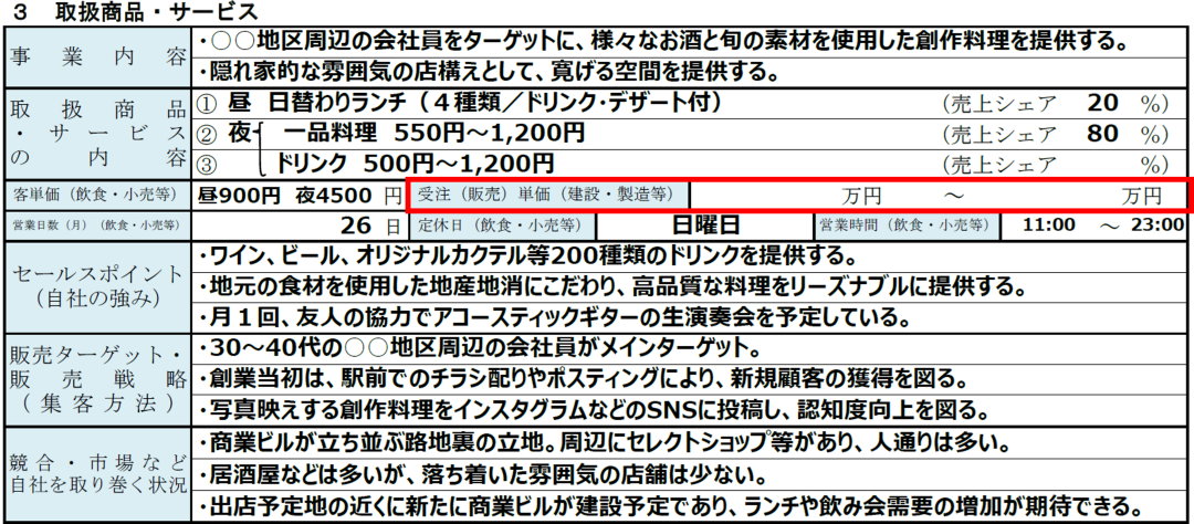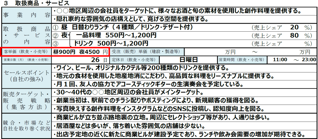 「取扱商品・サービス」の書き方|③客単価(飲食・小売等)