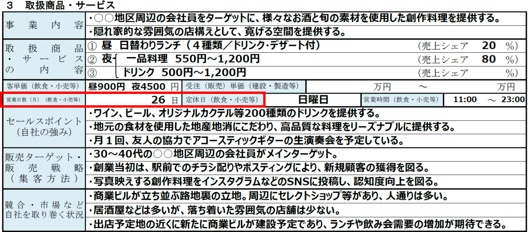 「取扱商品・サービス」の書き方|⑤営業日数(月)(飲食・小売等)
