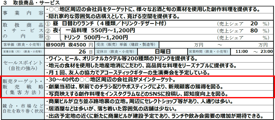 「取扱商品・サービス」の書き方|⑨販売ターゲット・販売戦略(集客方法)