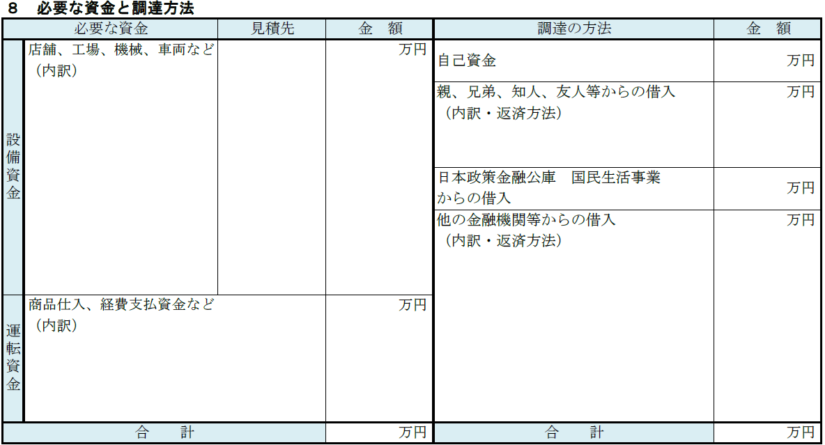 この項目では、創業にあたって本当に必要な金額はいくらなのか、その資金をどのように用意するのかを、数字で明確に示すことが求められます。