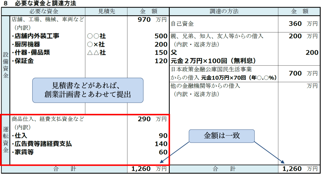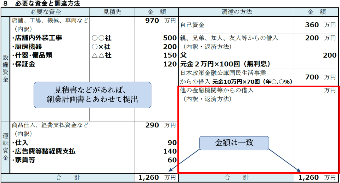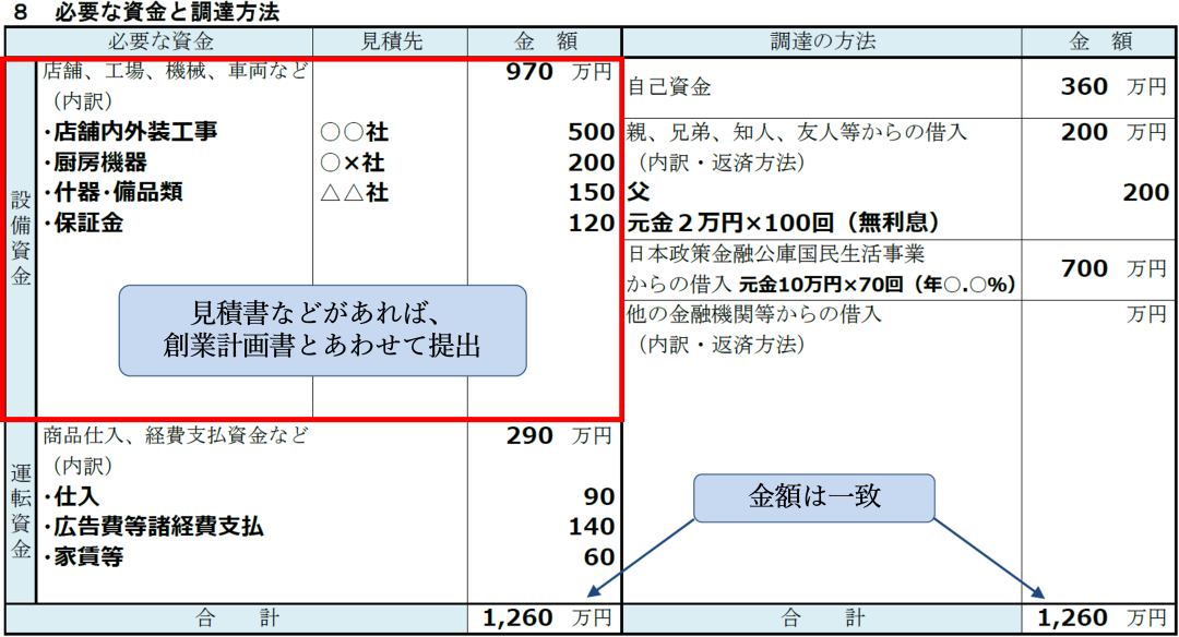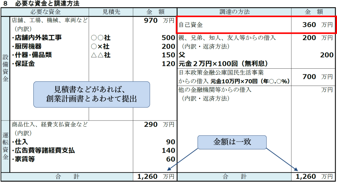 必要な資金の合計と、調達方法の合計が一致していない計画は、それだけで信頼性を欠きます。資金の使い道と、その資金をどこから持ってくるのかは必ずセットで考え、総額が一致するように整理しましょう。