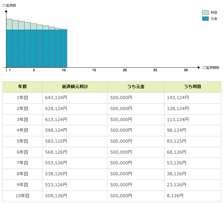 返済シミュレーションを行うことで、融資額、金利、返済期間、据置期間が返済総額にどのような影響を与えるかを明確に把握できます。たとえば500万円を金利3%、返済期間10年で借り入れた場合、毎年の返済金額は元金50万円・利息14万円になります。こうした返済金額と事業の利益構造を照らし合わせ、無理のない返済計画になっているかを十分に検討する必要があります。